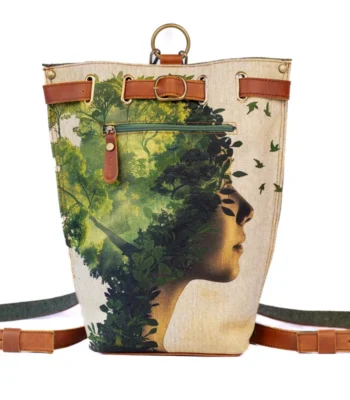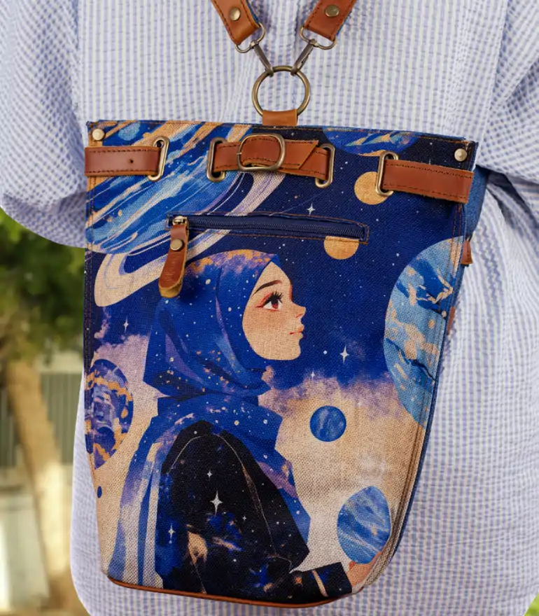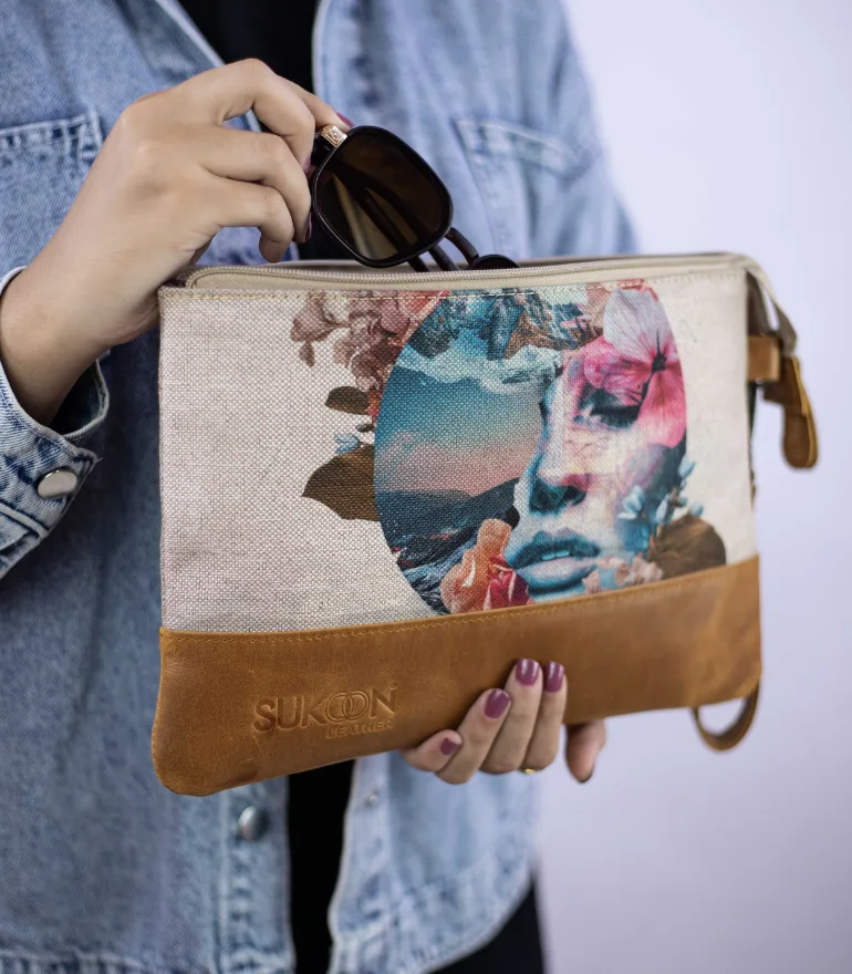 Crafted with sturdy Linen and genuine tan leather, this Sukoon Leather clutch carries a dreamy face design adorned with pink and blue floral details. A unique accessory that blends art and style effortlessly.