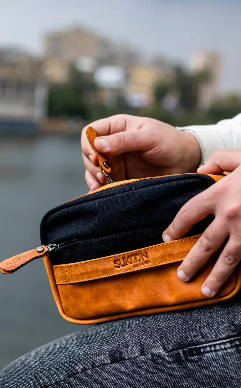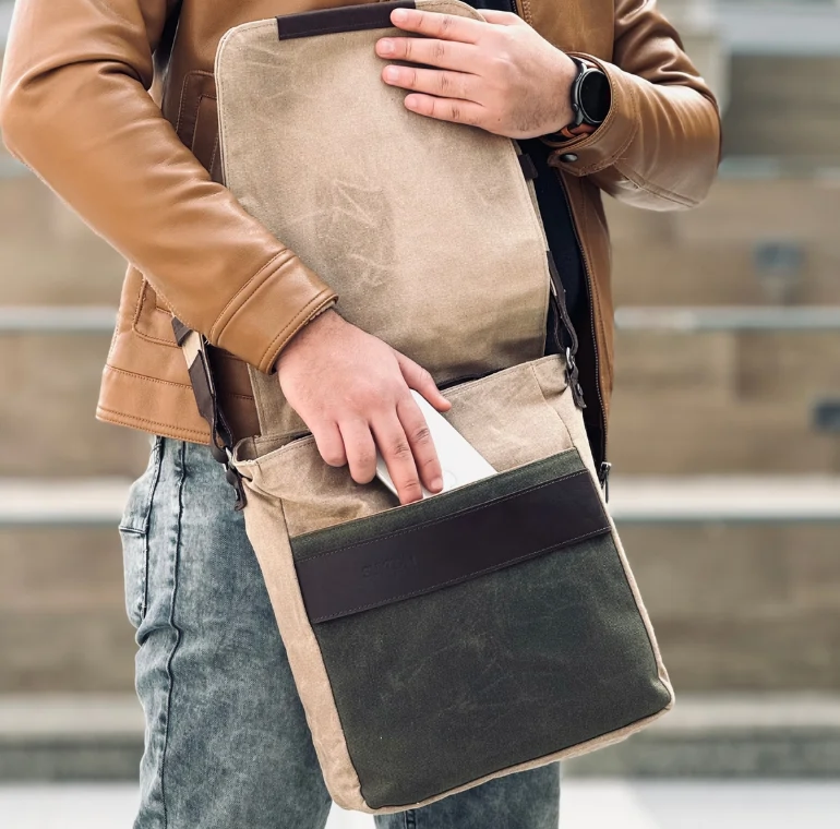 The Sahara Earth Messenger by Sukoon Leather captures the warmth and beauty of the desert landscape. Made with premium brown genuine leather and waxed tan canvas, this bag combines durability with timeless style.