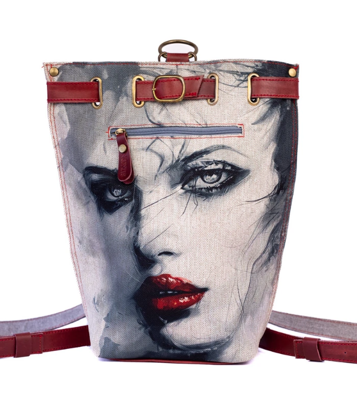 The bag features a grayscale painted face with sharp, dramatic eyes and bold red lips. It’s accented with red pull-up leather straps and trim.