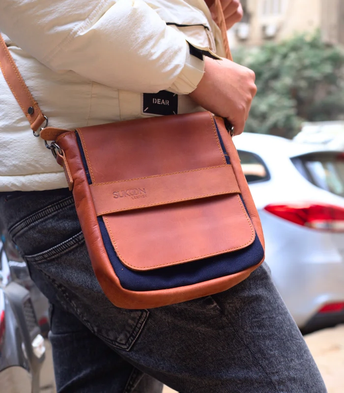 The Desert Midnight Messenger by Sukoon Leather combines the elegance of genuine tan leather with the durability of high-density, waxed navy canvas.