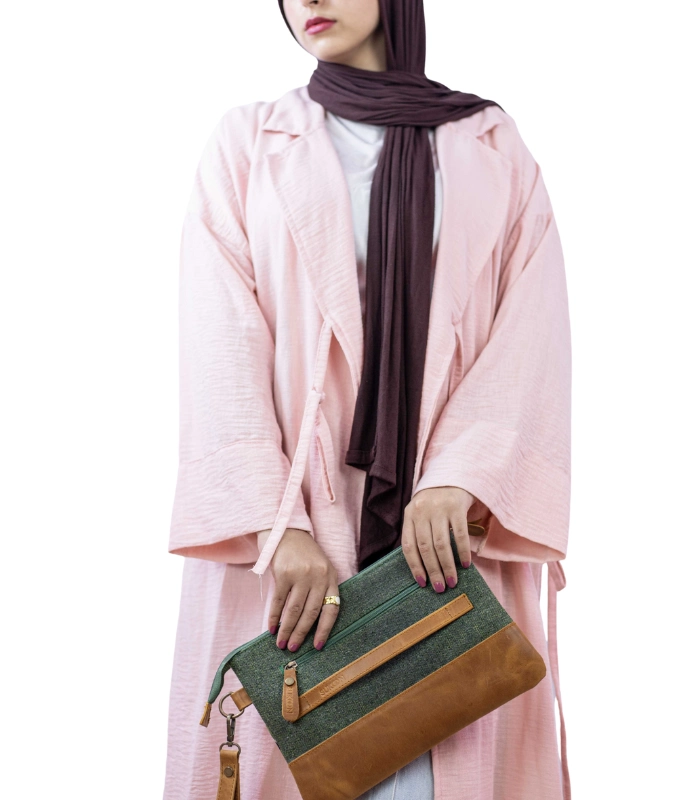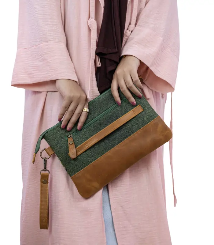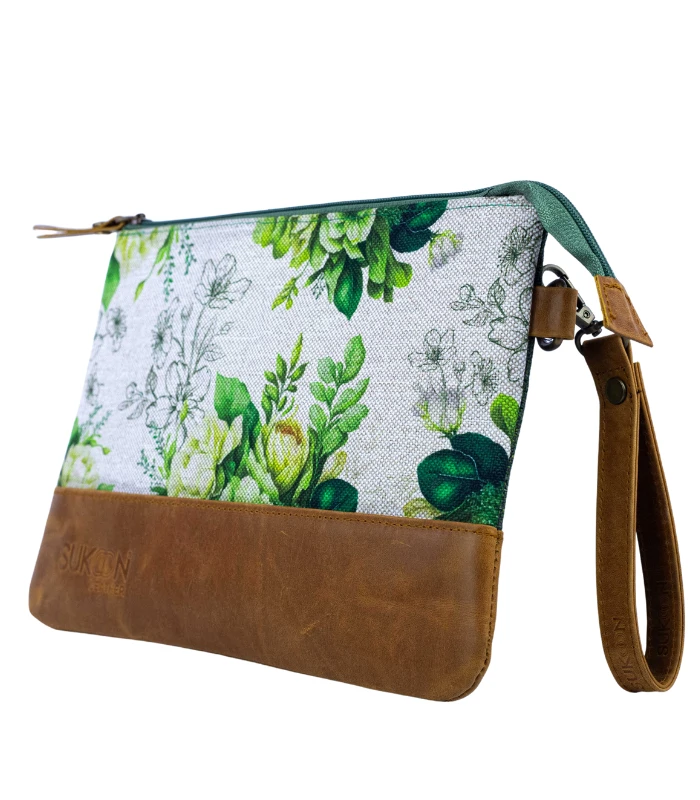 Designed with fresh green floral prints on Linen, this Sukoon Leather clutch captures a natural, botanical vibe.