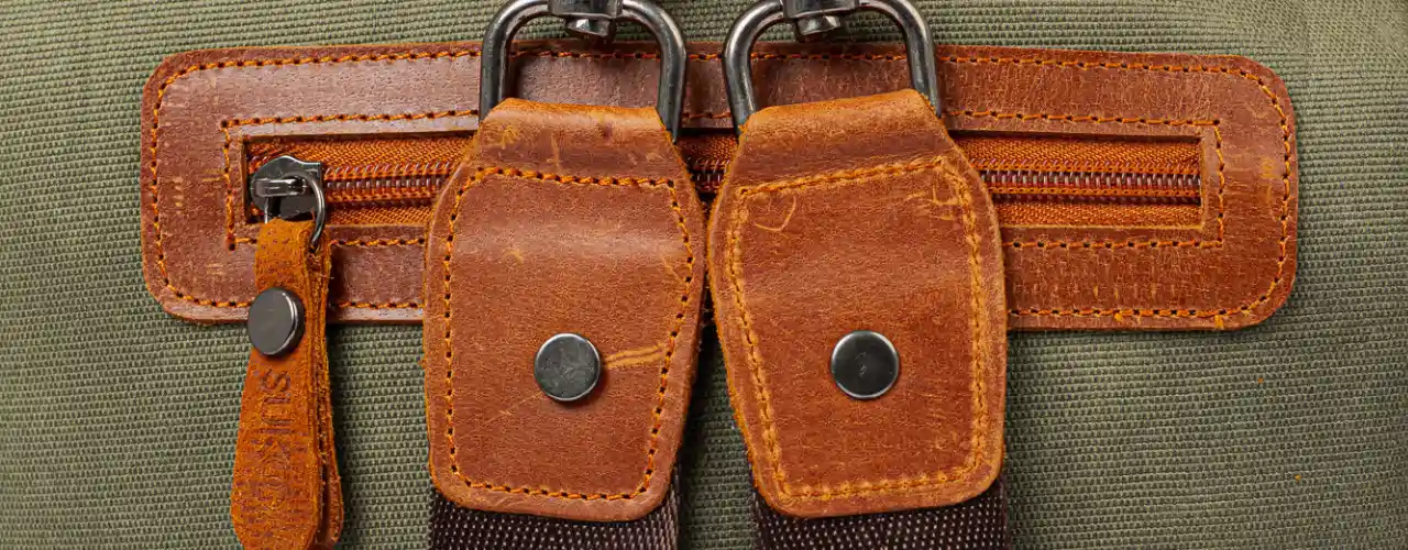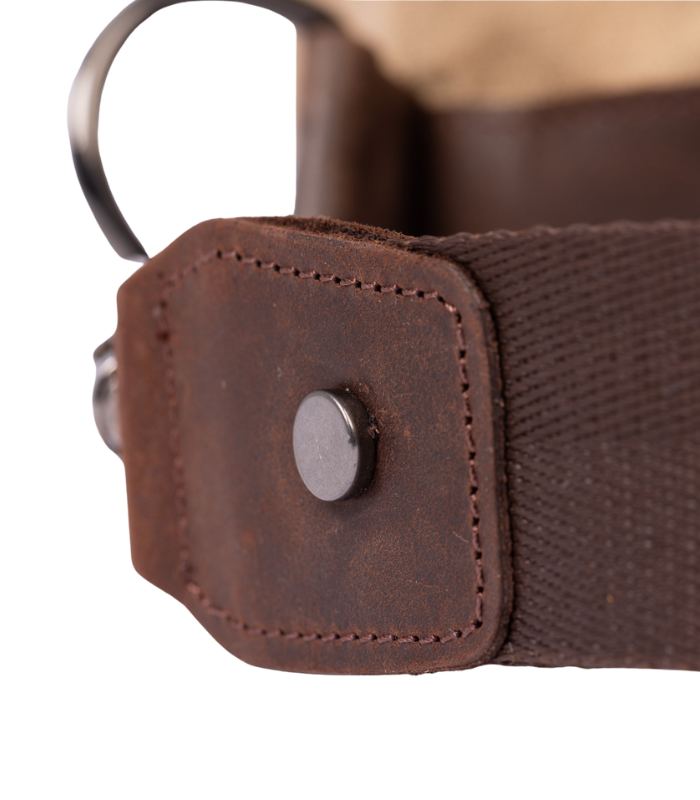 A warm sand beige waxed canvas body paired with deep chocolate brown pull-up leather. The contrast gives it a timeless and elegant look that suits both casual and refined styles.