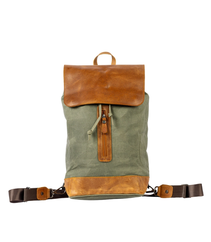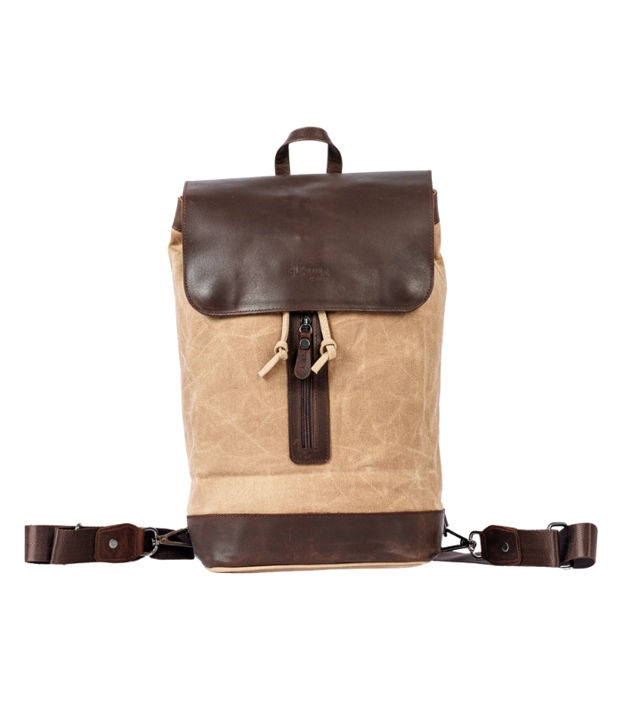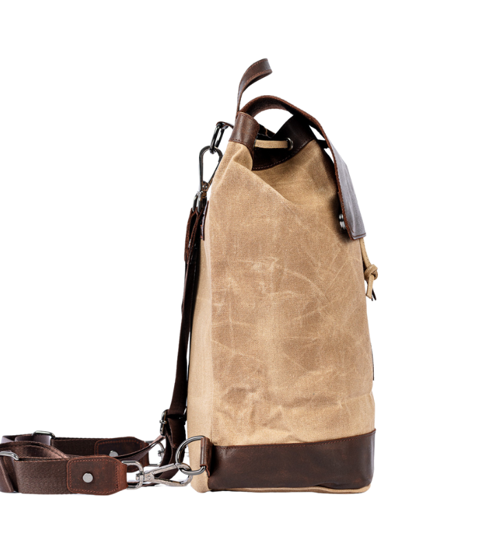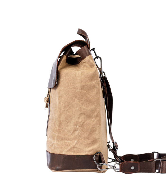 The sand beige waxed canvas of this backpack is beautifully juxtaposed with chocolate brown leather elements.