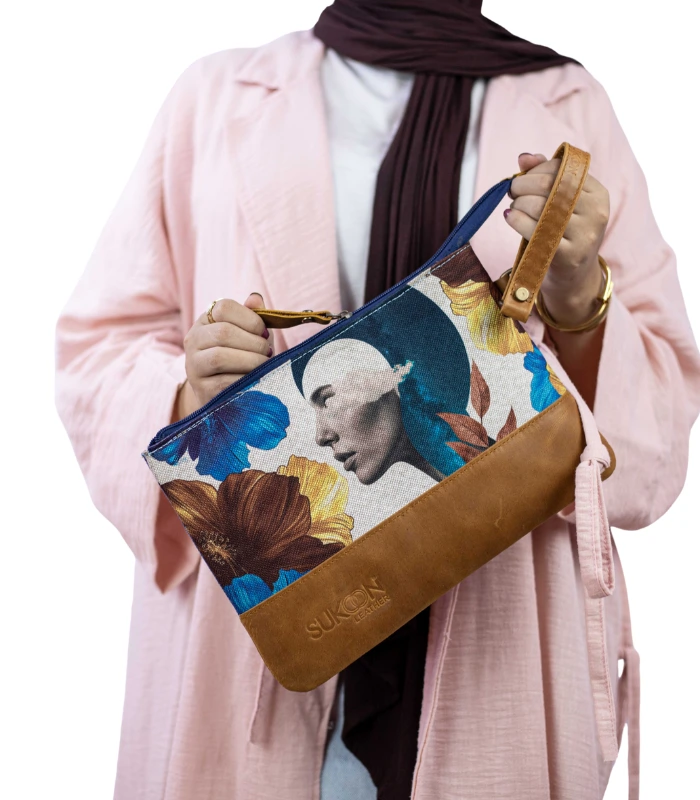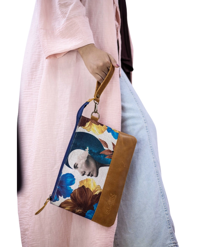 This clutch bag from Sukoon Leather combines durable Linen with a tan leather base.