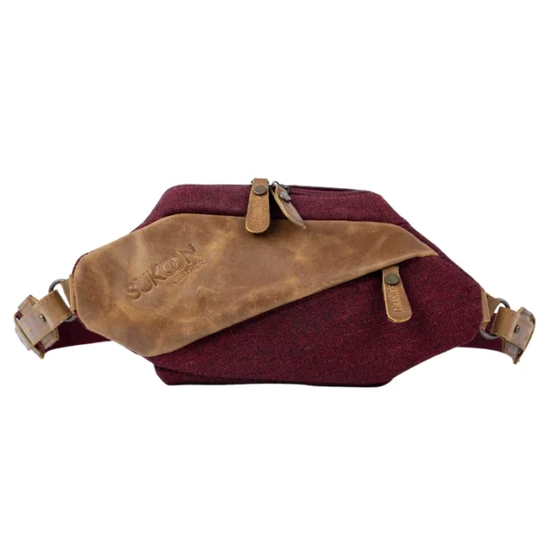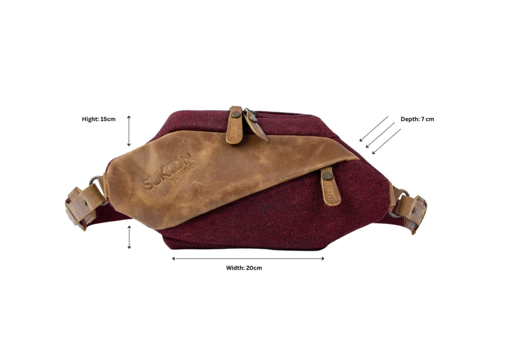 The Crimson Nomad waist bag by Sukoon Leather makes a bold style statement with its maroon Linen and tan leather base.