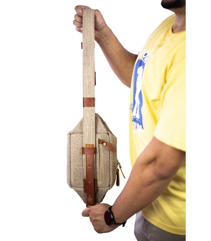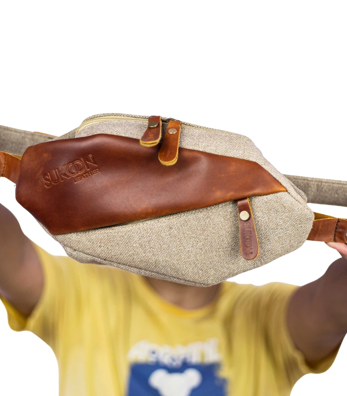 The strap is crafted from pull-up leather combined with matching linen fabric, adjusts easily to fit different styles of wear like (across the chest or around the waist or shoulder wear.